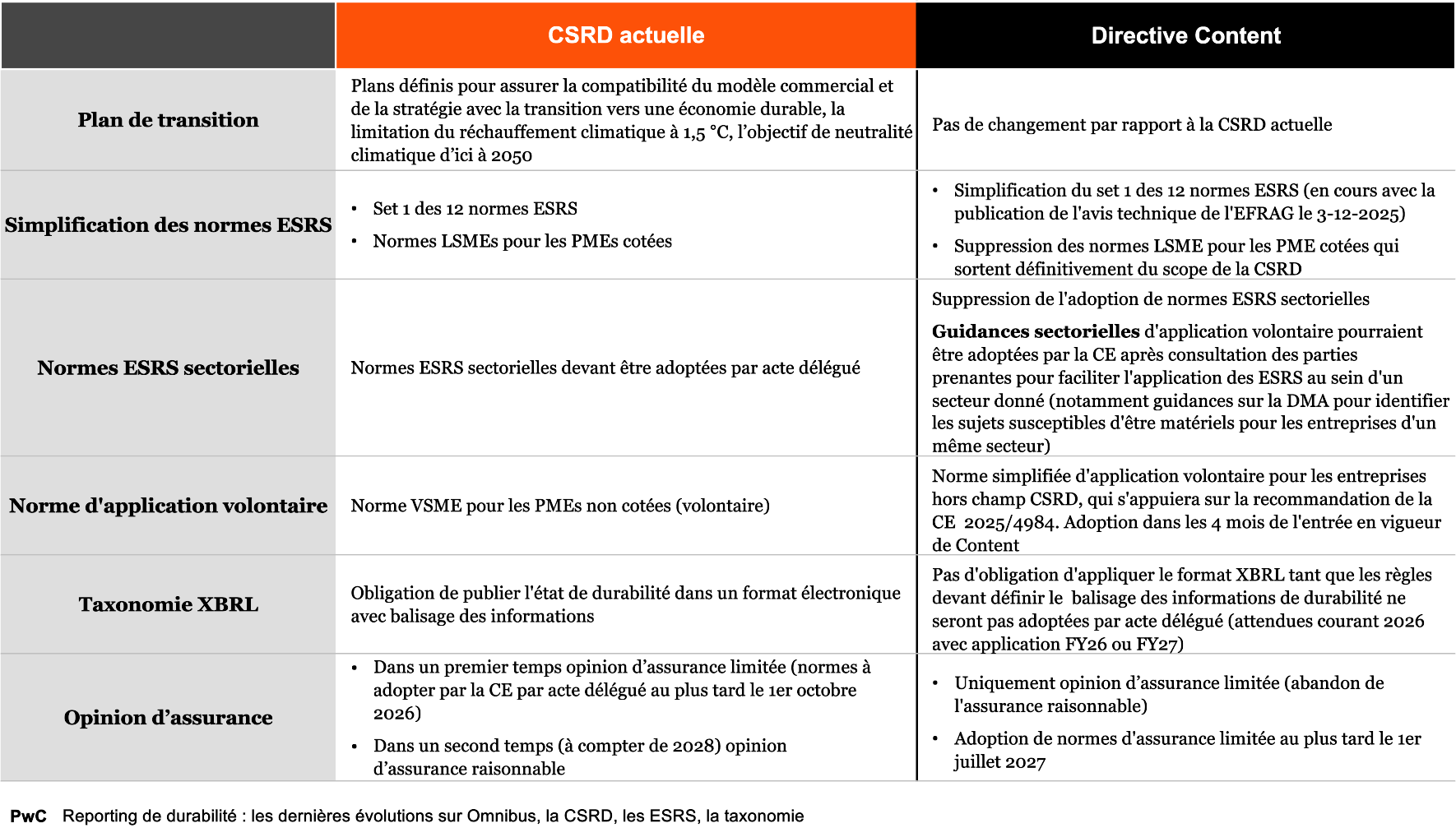 La directive "Content" prévoit la révision de l'acte délégué établissant les 12 normes ESRS, dans le but de réduire le nombre de points de données obligatoires en supprimant ceux qui sont jugés les moins importants, en donnant la priorité aux points de données quantitatifs et en établissant une distinction plus nette entre les points de données obligatoires et volontaires (sans nuire à l'interopérabilité avec les normes internationales et sans porter préjudice aux analyses de matérialité). La révision des normes ESRS est actuellement en cours avec la publication de l’EFRAG le 3 décembre dernier de son avis technique comprenant ses propositions de simplifications. Sur la base de l’avis technique de l’EFRAG, la Commission européenne adoptera un acte délégué révisant l’ensemble du set 1 des ESRS au plus tard dans les six mois après l'entrée en vigueur de la directive "Content". Pour une vue détaillée des simplifications proposées par l’EFRAG et le calendrier, voir le In Depth de PwC (lien). Voir également notre alerte (lien).