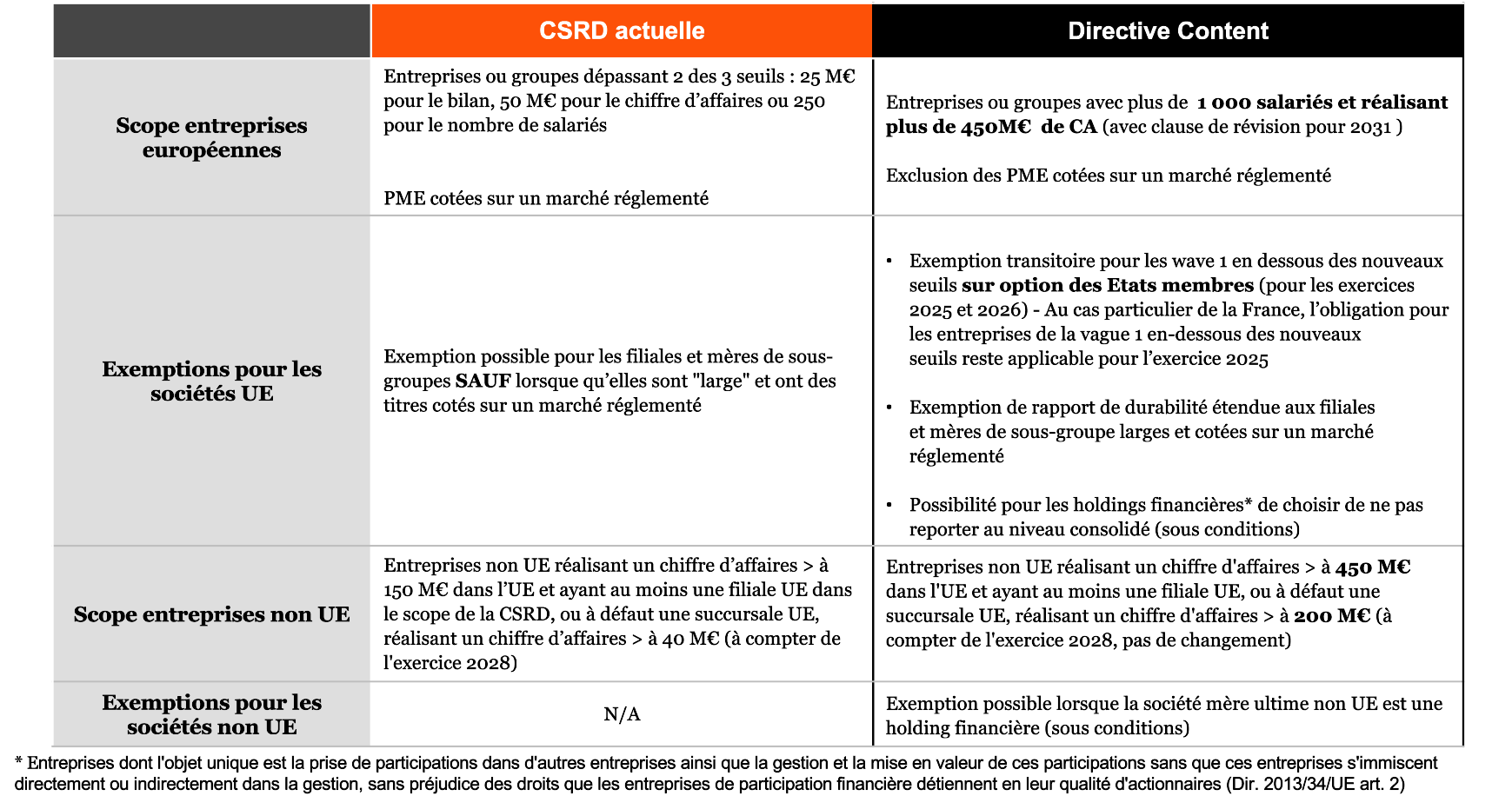 - le relèvement des seuils actuels : la directive "Content" remplace les 3 seuils de 25 M€ de bilan, 50 M€ de CA et 250 pour le nombre de salariés par deux seuils cumulatifs de 1000 salariés et de 450 M€ de chiffre d’affaires. La directive "Content" prévoit une clause de révision concernant ces nouveaux seuils pour une éventuelle extension future du champ d’application. Ces nouveaux seuils s’appliqueront aux exercices ouverts à compter du 1er janvier 2027. La logique vague 1/vague 2/vague 3 est donc remplacée par une logique binaire, ie au-dessus des seuils (reporting obligatoire) vs en dessous des seuils (reporting volontaire). Sur les impacts pour les entreprises de la vague 1 en dessous des nouveaux seuils, voir ci-après ;